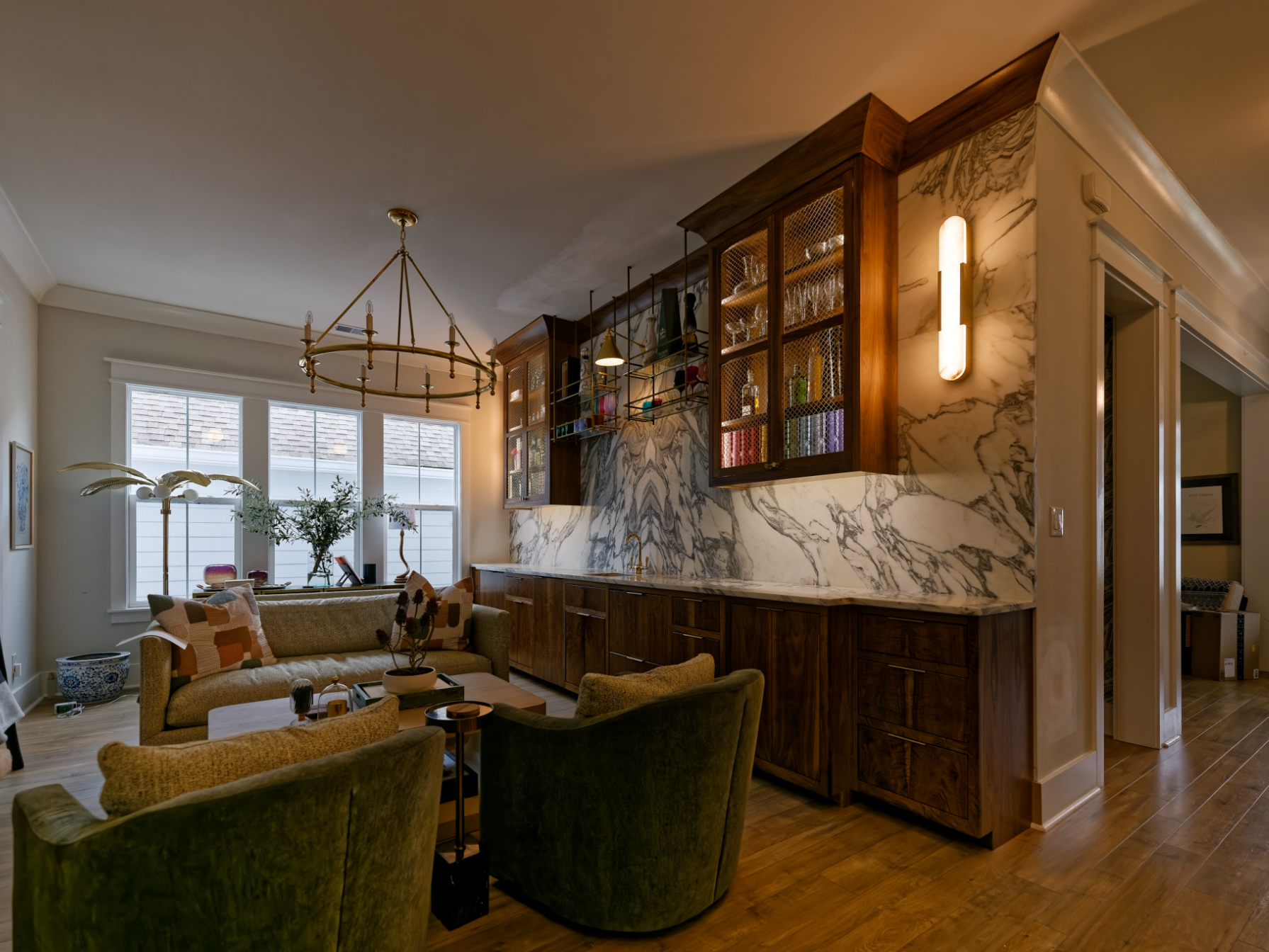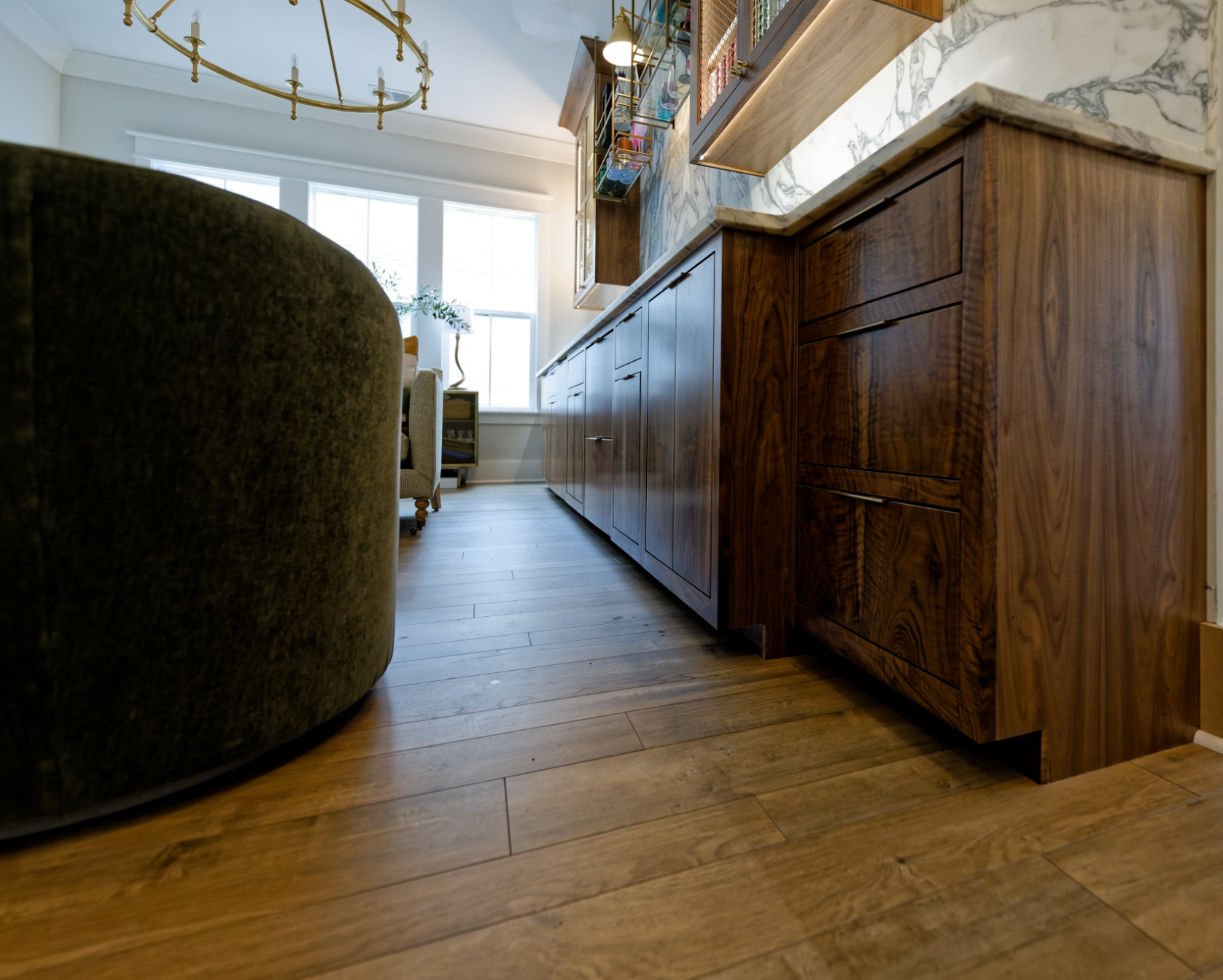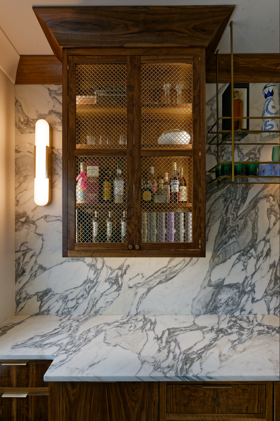 1% of all walnut is figured walnut, so that makes this bar ONE of a kind. Book matched figured walnut door & drawer fronts on all panel ready appliances inset cabinets.